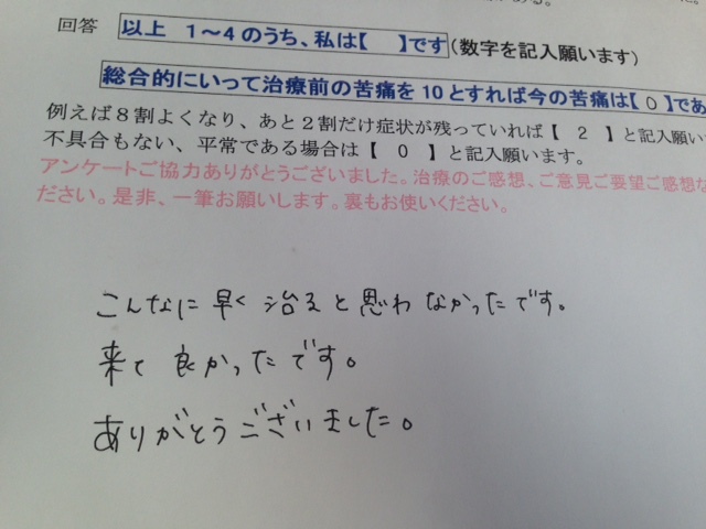 この時は1週間に3回治療して治りました。3回目に以下のアンケートをいただきました。